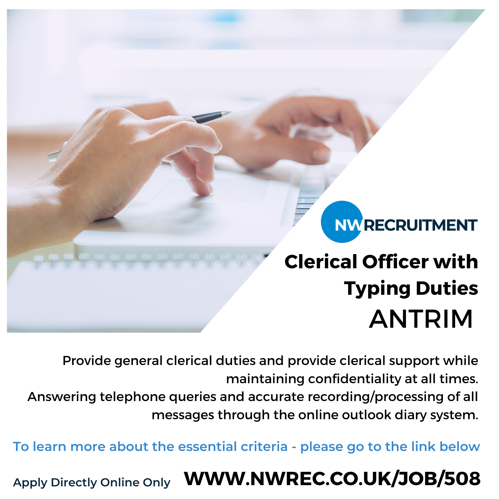 NW Recruitment are looking for a Clerical Officer with Typing Duties in Antrim – If you are interested in learning more and applying please go to: www.nwrec.wsini.com/job/508