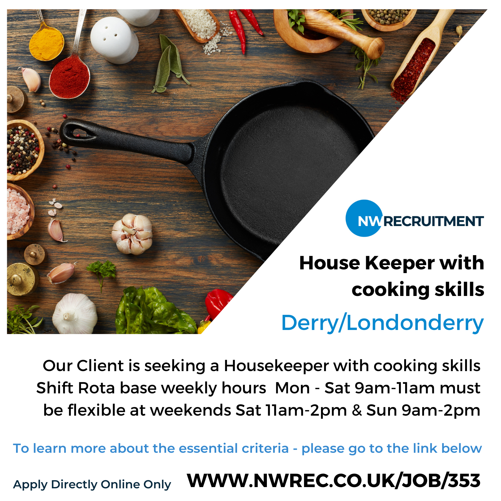 #NWRecruitment is looking for a House Keeper with cooking skills in #Derry#Londonderry Shift Rota base weekly hours Mon – Sat 9am-11am must be flexible at weekends Sat 11am-2pm & Sun 9am-2pm