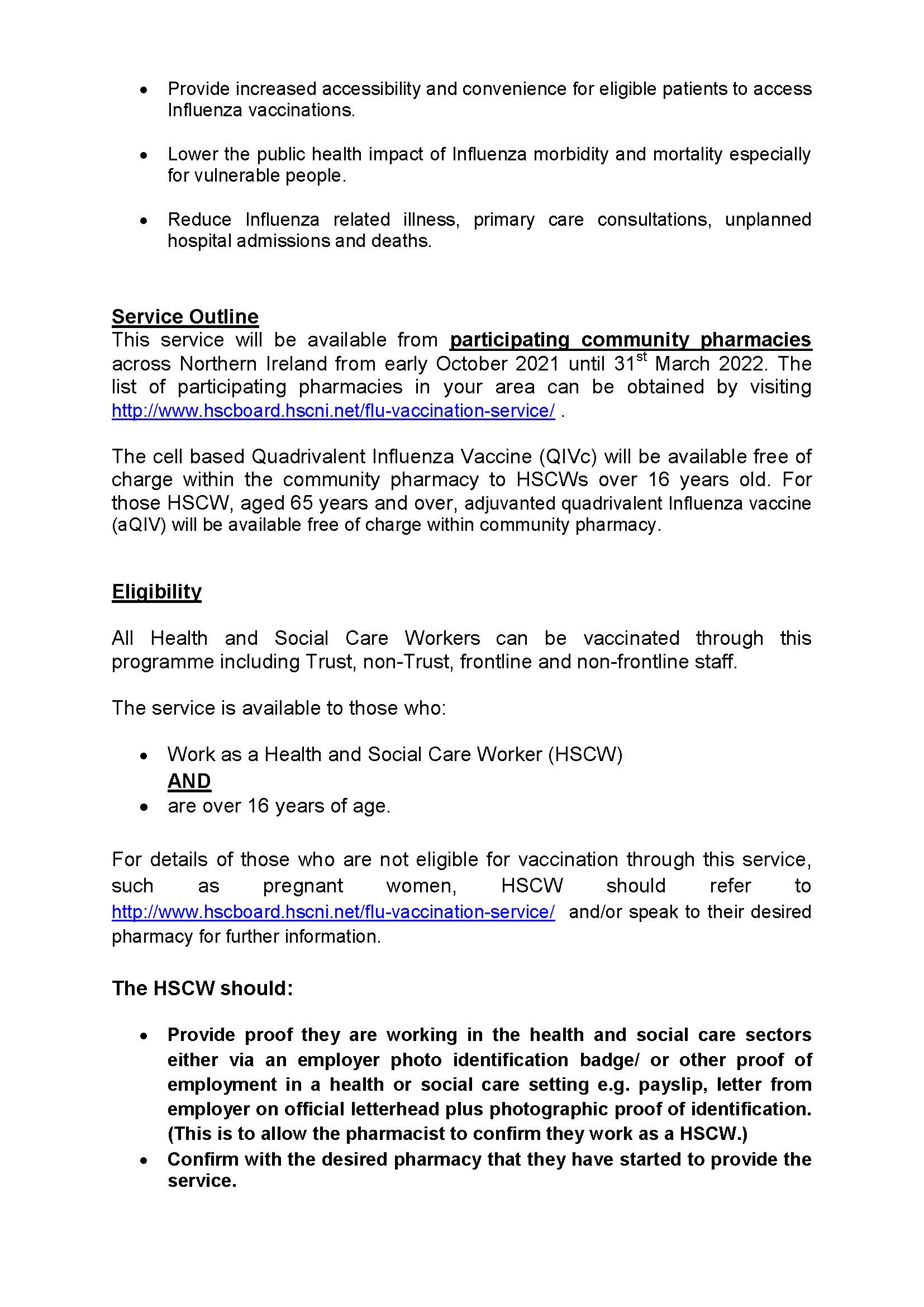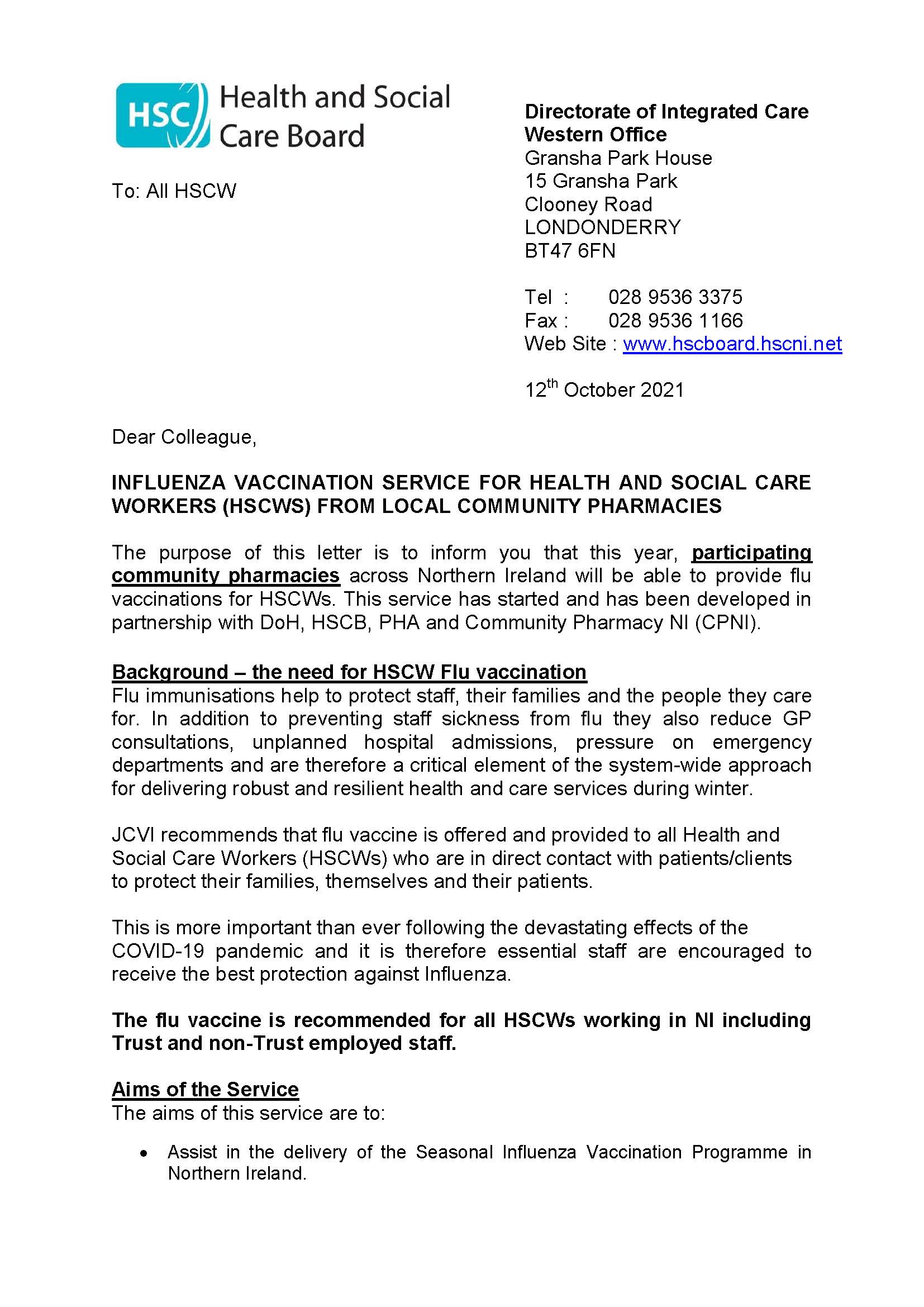 INFLUENZA VACCINATION SERVICE FOR HEALTH AND SOCIAL CARE WORKERS (HSCWS) FROM LOCAL COMMUNITY PHARMACIES